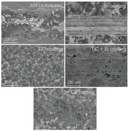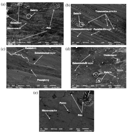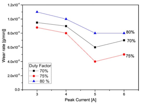 Philip et al. [92] used a Cu electrode in the EDM process to modify the surface of Ti-6Al-4V and investigated the tribological properties by using a pin-on-disc tribometer at several high temperatures (200 °C, 400 °C, and 600 °C) and by varying an applied load ranging from 50 to 150 N. The hardness of the EDMed workpiece increased four-fold due to the formation of several oxides such as TiO2, Ti8O15, and Ti24C15. At 200 °C and 100 N, the tribological performance was much improved because of the formation of oxide layers; however, at higher temperatures and applied load (150 N), the materials were worn out by spalling. It was also found that the formation of Ti24C15 not only resulted in a high hardness but also protected other oxides and played a noticeable role against wear.