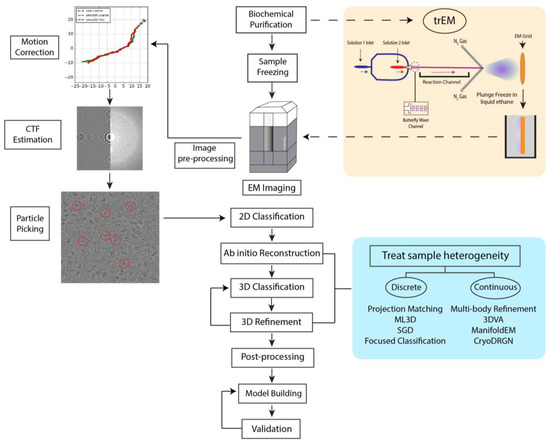 Figure 1. Schematic representation of a typical cryo-EM processing workflow. After biochemical purification, samples are rapidly plunge-frozen in liquid ethane and imaged in an electron microscope. In time-resolved cryo-EM (trEM) (orange box), biochemical reactions are frozen at different time points to elucidate structures of reaction intermediates. The schematic in the orange box depicts a microfluidic mixing-spraying method that utilizes a microfluidic chip to mix, incubate, and spray reactants onto a cryo-EM grid prior to plunge-freezing. The data is acquired with a cryo-electron microscope. The resultant data is processed in multiple stages, including image pre-processing, 2D and 3D classification, post-processing, and model building. Image pre-processing steps (left) include motion correction, CTF estimation, and particle picking, in which particles are selected for downstream processing. The selected particles are indicated by red circles. Following the 2D classification of particle images, various strategies can be employed to resolve sample heterogeneity. These strategies are outlined in the blue box. Multiple 3D reconstruction approaches are available to resolve discrete heterogeneity, including projection matching [56], 3D maximum likelihood (ML3D) [57], ab initio modeling using stochastic gradient descent (SGD) [16], and focused classification [58]. Recently, several methods have also been developed to address continuous heterogeneity, including multi-body refinement [15], 3D variability analysis (3DVA) [17], manifold embedding (ManifoldEM) [18], and CryoDRGN (Deep Reconstructing Generative Networks) [19]. Image post-processing, model building, and structure validation complete the workflow.