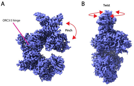 Figure 6. Twisting (A) and pinching (B) movements of the open human recognition complex (ORC) were revealed by PCA employed by multi-body refinement in RELION and 3DVA in cryoSPARC [166]. Both motions emanate from a hinge at the interface of the ORC3 and ORC5 subunits. The cryo-EM map shown in the figure is the map of the open ORC, (EMD-22417).
