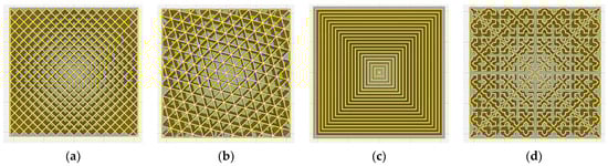 The top views of a prismatic volume (40 × 40 × 10 mm3) with various infill patterns defined by 2D models: (a) grid, (b) triangles, (c) concentric, (d) cross.