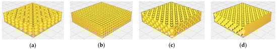 The perspective views of a prismatic volume (40 × 40 × 10 mm3) with various infill patterns defined by 3D models: (a) cross 3D, (b) gyroid, (c) quarter cubic, (d) octet subdivision.