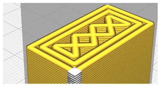 The peripheral contours, the lower layers and the upper layers constitute a shell that closes the filling volume and gives the shape of the piece. The ratio of the shell material volume to the infill material volume increases under certain conditions: small parts; low infill densities; high number of top/bottom layers and peripheral contours. In such cases, the contribution of the shell to the load bearing capacity of the piece increases as well [13]. An eloquent example in this regard is a tensile specimen with a small cross-section. For instance, the area occupied by the infill of an ASTM D638-14 type IV tensile specimen [14] with a 3.2 × 6 mm2 cross-section, printed in the ZX or ZY build orientation [15], with two peripheral layers of 0.4 mm (Figure 4), represents only 37% of the cross-section. To conclude, for an accurate analysis of the results obtained from mechanical tests on specimens with small cross-sections, the following parameters should also be considered: the number and the thickness of the lower and upper layers, the wall line number, and the wall thickness.