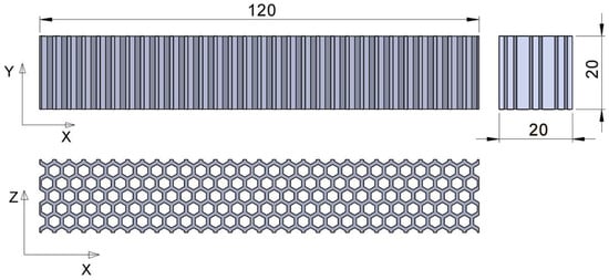 The geometries of the three types of structures analyzed in this paper (honeycomb, grid and triangles) were modelled in the SolidWorks 2020-2021 software (Dassault Systèmes, Vélizy-Villacoublay, France). The structures were fitted into a prismatic volume of 120 mm length and 20 × 20 mm2 cross-section (Figure 5). A square cross-section was chosen so that a comparative analysis of Z- and Y-axis behavior could be performed. The cross-section dimensions of the specimen for the three-point bending tests were increased relative to standard dimensions in order to increase the number of cell rows arranged across the width of the specimen. The length of the specimen was correlated with the cross-section.
