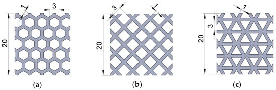 The detailed views of structures’ cells: (a) hexagonal, (b) grid, (c) triangles.