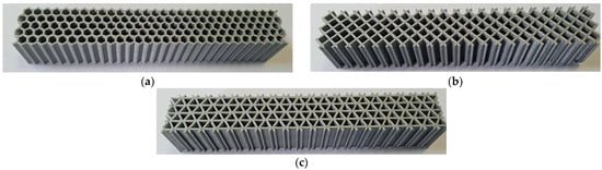 The structures defined by 2D patterns with regular polygonal cells (hexagon, square, triangle) are characterized by the specific dimensions of the polygons and the distances between two neighboring polygons (wall thickness) [38]. In this research the cell wall thicknesses were identical in all three structures, and the characteristic dimensions of the polygonal cells were chosen assuming that the specimen volumes were of the same scale order. A specific dimension of 3 mm was used to define the inner of the cells and the wall thickness was kept constant at 1 mm (Figure 6). The layout of the hexagonal/ grid/ triangular cells was made so that the structures were symmetrical relative to the median planes. Therefore, the X, Y and Z axes were the main axes of inertia.