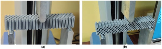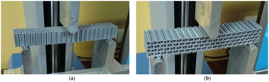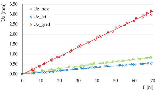 The conclusions of this analysis of the three-point bending displacements should be correlated with the orientation of the structures’ cells. The effect of changing the orientation of hexagonal/triangular/grid cells through rotation in the (XZ) plane was not included in this analysis. The cell orientation influences the consumption of the material [40] and the mechanical behavior of the structures [41]. Furthermore, changing the position of the force relative to the center of the polygonal cells determines the changes in the mechanical behavior of the structure [42].