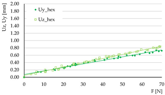 The deflections obtained in the three tests carried out for each type of structure were represented graphically, plotting the average force-deflection variation. The tests were carried out in the elastic domain; thus, the variations were linear. Figure 14, Figure 15 and Figure 16 show the deflection variations (force applied on the Y-axis of the specimen) and (force applied on the Z-direction) resulting from the experimental tests for the three types of structures. For the hexagonal structure the variations and have similar slopes. The same type of behavior is observed for the triangle structure. In the grid structure the tangent of the variation is substantially higher than the tangent of the variation .