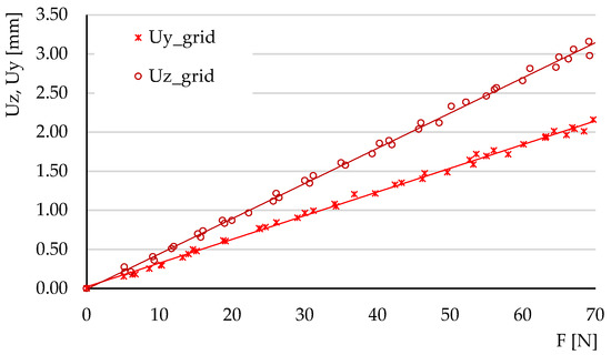 FEM analyses of three-point bending were performed for seven force values, ranging from 10 N to 70 N, determining the functions and and the tangents of these functions. Figure 19, Figure 20 and Figure 21 show the charts of displacements for .