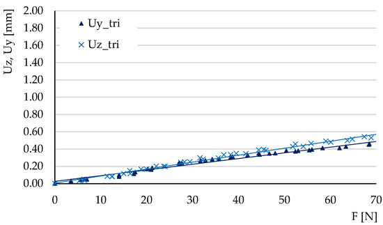 The variations of deflections Uy = f(Fy) and Uz = f(Fz) for the triangle structure, in experimental three-point bending.