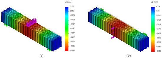 The Uy and Uz displacements charts obtained from FEM analysis of three-point bending of the hexagonal structure: (a) Fy = 70 N, (b) Fz = 70 N.