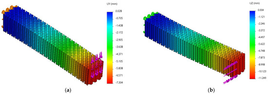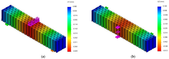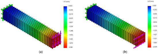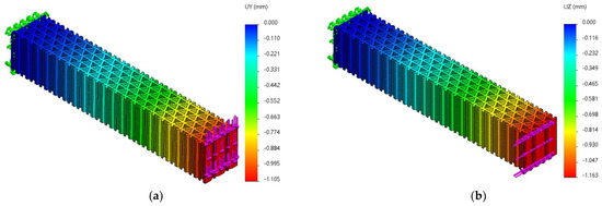 The Uy and Uz displacements charts obtained from FEM analysis of three-point bending of the grid structure: (a) Fy = 70 N, (b) Fz = 70 N.
