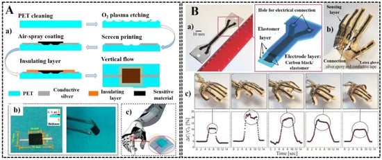 The advancement of soft electronics and smart materials-based sensors for temperature sensing and strain monitoring. (A) The development of a flexible PET and graphene oxide-based temperature sensor showing the (a) the fabrication steps of the sensor, (b) the final sensor, and (c) the application of the sensor for internet of things. Reproduced from Liu et al. under a Creative Commons Attribution 4.0 International License (CC BY 4.0). Copyright (2018); (B) Wearable strain sensor developed by using a carbon black-filled elastomer composite. (a) The different layers of the sensor, (b) five different strain sensors developed on a glove, and (c) the use of an intelligent glove fabricated with strain sensors. Reproduced with permission from Shintake et al. © 2022 Wiley.