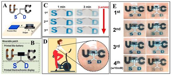 Sweat-powered wearable electrochromic biosensor for lactate monitoring. (A) Design and working principle of the wearable sweat sensor. (B) Different parts of the sensor i.e., printed bio-battery and electrochromic display. (C) Change in color of the electrochromic display after addition of human sweat samples. (D) Schematic of the sensor applied for on-body measurements, and (E) On-body images of the device with reversible behavior up to four switching cycles. Reproduced with permission from Hartel et al. © 2022 Elsevier.