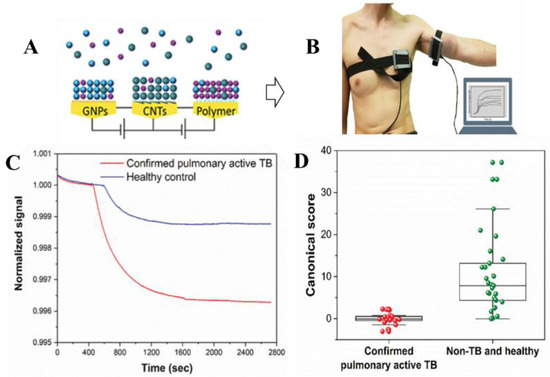 VOCs sensor for tuberculosis detection. (A) Nanoparticle modified sensor array; (B) Wearable devices on the chest and anterior arm of a volunteer for VOCs measurement; (C) Normalized signals of the wearable device attached to the anterior arm area; (D) Use of Discriminant Function Analysis (DFA) based pattern recognition to distinguish between healthy and diseased samples. Reproduced with permission from Vishinkin et al. © 2022 Wiley (under Creative Commons CC BY license).