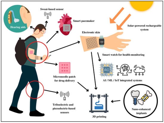 Energy harvesting: the main stumbling block in healthcare technology is the ability to power medical devices, particularly implantable ones. Devices to harvest biomechanical energy of the body have been developed to make implantable micro/nano self-powered systems that can operate long without needing to replace batteries. Various energy harvesters (EHs), such as triboelectric nanogenerators (TENGs), thermoelectric generators (TEGs), and piezoelectric nanogenerators (PENGs), malleable solar cells and photovoltaic (PV) platforms, for sunlight’s energy harvesting and light converting biochemical react to an electrical signal by using chemical and gas sensors [98]. These materials are also an excellent choice for harvesting biomechanical energies from body motions, the external environment, or body heat. Hence, smart wearables are a reliable and effective way to monitor patient vitals. It uses smart materials to provide a sensing platform, and electronics help collect and process data [99].