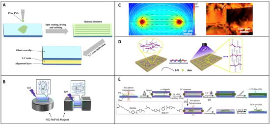 (A) Scheme of an alignment with substrate-coated LC cell. (B) Magneto-responsive mesogenic orientation [31]. Copyright © 2016 American Chemical Society. (C) Electric field-driven LC molecular orientation [33]. Copyright © 2021 Carlotti M et al. (D) Doped LC resin with UV-responsive azobenzene [34]. Copyright © 2018 Elsevier Ltd. (E) LC molecular orientation via repatterned glass substrate with two-photon polymerization [39]. Reproduced under the terms of the Creative Commons CC BY license. Copyright 2020, Wiley-VCH.