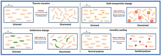 Some dopants, such as gold nanoparticles [46,47], carbon nanotubes, dies [48,49], or monofunctional azobenzenes, can produce a photothermal effect by absorbing light energy and transforming some of it into heat. This increase in temperature will locally allow greater freedom of the molecules in the surroundings and, if incorporated into LC mixtures or polymers, will allow the LC to reach the TN-I, creating a disorganization of the molecules. By incorporating such dopants in an LC resin and, after alignment of the mesogens, polymerizing it, a structure responsive to light can be obtained. Several factors will be at play concerning the intensity of deformation such as the density of photothermal entities and the degree of crosslinking influencing the heat diffusion. The illumination wavelength can be tuned with the incorporation of different particles. For gold nanoparticles, almost the whole spectrum can be used for their light absorption by varying their size and shape. For example, a cylindrical gold nanoparticle can absorb both UV light corresponding to its tubular axis absorption and at 532 nm with the perpendicular axis absorption. Making the tubes longer allows the particle to absorb in UV and at 800 nm. Nowadays, using this theory, researchers try to create structures with multi-responses to several wavelengths. Light is a low-cost actuation but is also problematic because of its low penetration depth.