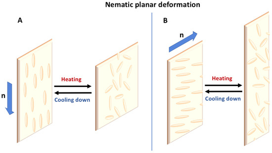 For LC films in an aligned molecular order following a director axis n, upon activation, a contraction will occur along the n axis as illustrated in Figure 4. This happens when the sample is heated as the TNI is reached causing misalignment of the LC molecules and their contraction. They will get closer to each other, reducing the length of the material in its aligned axis. In Figure 4A, the molecular orientation is designed to be parallel to the film’s long axis. By applying the stimulus heat to the samples, the film will be reduced in size along the Z-axis corresponding to its former orientational axis and thereby expand in the X- and Y-axes. Conversely, Figure 4B corresponds to an orientation of the molecules in the short axis perpendicular to the film’s long axis. Upon heating the film, a contraction will occur in X-axis and there will be an elongation in the Y- and Z-axes. By using this principle, the programming of films at the macroscale can be engineered to obtain a certain movement in any planar direction. A differential molecular alignment in a planar film can induce 3D deformation as is the case in splay orientation when the molecules are progressively twisted along the n-axis. This can lead to a bending of the film to obtain a roll or a twisting to obtain a screw-like form. In addition, the thickness can be modeled to differ across the same film to obtain different contraction forces and thereby a 3D movement. At the microscale, the molecular alignment is more difficult to control and, in practice, is made by orienting an extended zone of material. For 2D objects, their alignment will depend on the alignment of the substrate they are fabricated on or an external stimulus such as a magnetic or electric field. For 3D objects, the same rule applies as they will be constructed layer by layer. If the orientation depends on the substrates, the order will change while the fabrication gets higher in resin content. The contact with the substrate will align almost perfectly with the resin nearby but further away moving upwards the resin gets more and more disoriented. In this way, a differential in orientation can be induced. Another way to create several orientations in a 3D object is to change the direction of the stimulus—generally a magnetic or electric field—during the fabrication. These differences in orientation can module the deformation of the final objects.