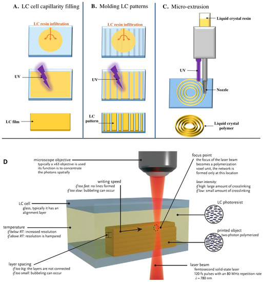 (A–C) Different techniques for the impression of objects at the micro-scale involving a photopolymerization reaction. (D) TPP applied to an LC pre-oriented cell [53]. Reproduced under the terms of the Creative Commons CC BY license. Copyright 2021, Wiley-VCH.