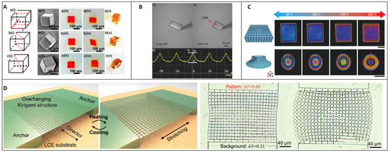 (A) Micrometric blocks with various orientations for millimetric-responsive structure construction [54]. Reproduced under the terms of the Creative Commons CC BY 4.0 license. Copyright 2021, Nature communications. (B) Photo-responsive micro-walkers [55]. Reproduced under the terms of the Creative Commons CC BY-NC 4.0 license. Copyright 2015, Wiley-VCH. (C) Micro-structuration of a woodpile and a spiral disc with observed expansion under thermal actuation [56]. Reproduced under the terms of the Creative Commons CC BY 4.0 license. Copyright 2021, Wiley-VCH. (D) Kirigami structure constructed on an LC film thermally actuated [57]. Reproduced under the terms of the Creative Commons CC BY 4.0 license. Copyright 2021, Wiley-VCH.