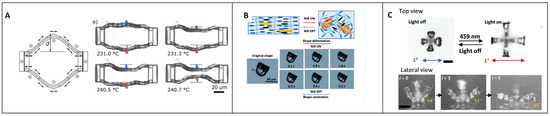 (A) Thermal actuation of an electrically aligned micro-object [58]. Reproduced under the terms of the Creative Commons CC BY 4.0 license. Copyright 2021, Wiley-VCH. (B) Light actuation of a micro-structure with a photothermal effect generated by gold nanoparticles [60]. (C) LC microstructures actuated with light at different wavelengths depending on the dye used [61]. Reproduced under the terms of the Creative Commons CC BY 4.0 license. Copyright 2022, Wiley-VCH.