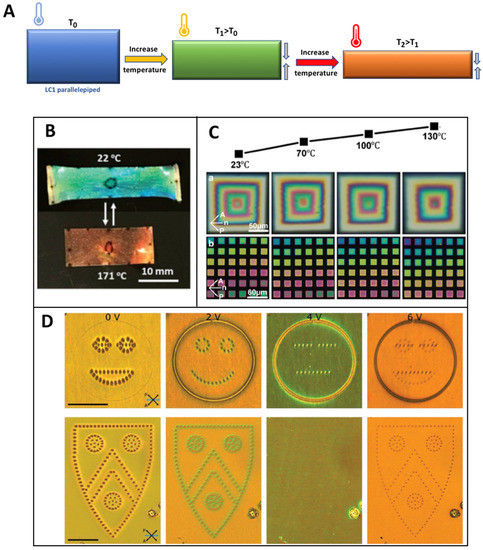 LC structures have the characteristic of shrinking along their molecular orientational axis under different stimuli and these changes are observable both structurally by optical microscopy and by their change of color under polarized light. A change in the thickness of LC objects will change the refractive index of the structure and its emission spectrum. Figure 8A explains how temperature induces a reduction in the thickness of a parallelepiped and subsequently how it impacts the color of the microstructure. At T0, which corresponds to room temperature, the parallelepiped is blue, but increasing the temperature to T1, will shrink the structure and turn it green. Increasing the temperature to T2 > T1 will again change the color from green to red. Since the maximum shrinkage is at T2, if the temperature is increased again no change of color will be observed. This characteristic has been demonstrated in numerous studies with LC films that are either stretched mechanically or shrunk by an external stimulus. Both of these techniques change the thickness of the films and induce a color change. This is demonstrated by Schenning et al. [65], as shown in Figure 8B, with thermotropic LC films where the alignment was achieved with a PVA-coated LC cell and fixed by UV light polymerization. Observation under polarized light has been performed at room temperature and the film appeared blue. Then, upon heating the film to 171 °C, a shrinkage along the director n and a change of thickness has been detected as the color changed to red. Furthermore, the article describes how to design a 3D beetle in from a 2D film that will be blue, where, upon activation, the beetle will flatten in a 2D film again and become red. This phenomenon is also well described in other publications [66,67]. Some groups, such as Sitti et al. [68], applied this strategy to micrometric structures, as demonstrated in Figure 8C. At this scale, it has been less described and has a great potential for sensor application or micro-robot detection. Heat was used as the source of activation as other techniques may be difficult to use at this scale. A pyramidal structure 10 microns high has been made and a different color is noticeable at each step. Likewise, squares of different thicknesses were fabricated next to each other to observe a gradual color change. The temperature was elevated from 23 °C to 130 °C with pictures taken at 70 °C and 100 °C in between. A clear color change was noticed and the idea of applying this phenomenon to microrobots and detecting their deformation through their color emission is mentioned. Other designs are studied by other groups with different actuation methods such as the work of Elston et al. [69] shown in Figure 8D. The molecular orientation was achieved through a coated LC cell with substrates made of ITO and the structures were fabricated by TPP. After development, a set of pillars were obtained that could be observed by optical or polarized light. They noticed that the refractive index could be changed by applying different voltages. By taking advantage of this observation, a reconfigurable smiley or shield was demonstrated (Figure 8D). We can see great changes in the shape and color while the current was increased due to the change in the refractive index. When the pillars are disappearing, this means that the voltage used to read the pattern is the same as the one used to write it. This work shows possible applications for LOGOs or passcode reading as well as art design. Other works have been submitted using an electric current to design pixels [70]. Many other works are based on other actuation systems that can influence color changes. This is the case in swelling structures [71] where the thickness is changed by swelling with water absorption and a clear color change can be observed. This non-destructive technique also requires very little energy compared to thermal or electrical actuators and is reversible. It can also be an anisotropic deformation regarding the anisotropic conformation of the molecules themselves.