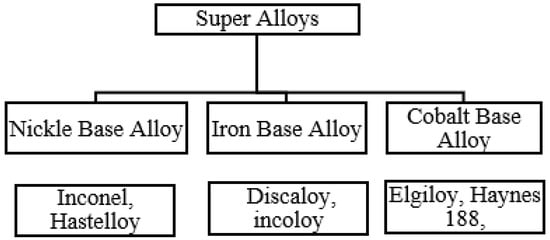 The micro mechanical process is more economical than the other manufacturing systems in micro domain [13]. Many challenges are connected with micro-mechanical manufacturing systems requiring a standard change from macro manufacturing-processes. These problems are mostly due to the small size of tools, parts and processes. The quality micro tools are greatly affected by smaller vibrations and extreme forces, which is not good for the tools’ lives and for the tolerances of components. It is hard to notice the loss of the cutting edges of micro tools [14,15,16]. In the field of micro milling, the material properties, the tooling specifications and machining parameters play a vital role in controlling the products’ quality. The quality can be enhanced by controlling these input factors [17]. Super alloys are an attractive choice for the modern industry sector, due to their ability to retain their properties at extreme conditions. They are usually based on nickel chromium, cobalt, or nickel-iron. These super alloys are divided into three broad categories, namely Iron base, nickel base and cobalt base alloys, as shown in Figure 1.