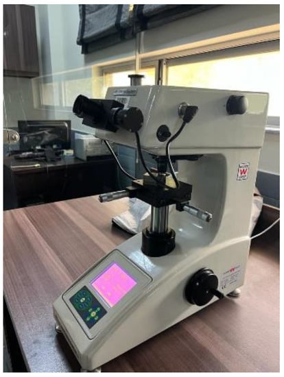 A tool pre-setter (BMD Messwell 410V) was utilized for accurate measurements of the Z axis. The dimensions of the work piece were 10 mm × 20 mm × 50 mm. The surface roughness of the Inconel 600 alloy was analyzed using an Olympus DSX1000 digital microscope. The Micro-Vickers Hardness Tester (401MVD–WOLPERT GROUP) was used to find the hardness of the workpiece, as shown in Figure 3. The dwell time was 6 s and a 9800 mN force was used during these five tests, which were carried out at multiple locations on the work piece. The average value of micro hardness was calculated as 361 HV.