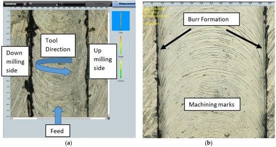 Figure 5a shows the micro milled slot of Inconel 600 alloy, indicating the feed direction, rotation of the micro tool, and up and down milling sides. Meanwhile, Figure 5b indicates the edges of the micro milled slot of the work piece, showing dull black and uneven protrusions, which are burr-produced during micro machining operations. It also indicates that the dull black marks (away from the edges of the milled slot) are actually machining marks on the finished surface, and therefore these can be neglected.