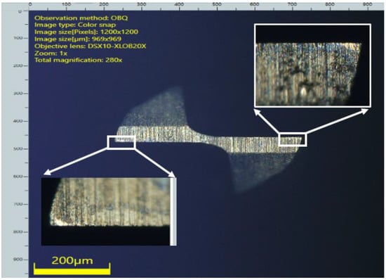 The scanning electron microscope, SEM–JEOL JSM-6490A, and Olympus DSX 1000 digital microscope at multiple magnifications, have been used for analyzing and calculating the top burr width and top burr height in both cases, namely the up milling and down milling sides. The average values of the results have been calculated (Figure 4) and displayed in Table 7.