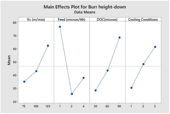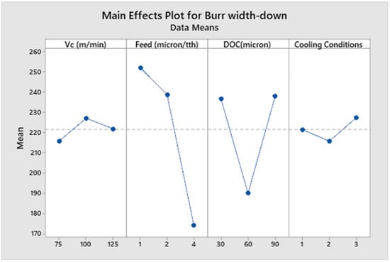 Figure 8, Figure 9, Figure 10 and Figure 11 show the main effect plots related to top burr width (up and down milling cases) and burr height (up and down milling cases), and the results are shown in Table 7. We observe the nonlinear behavior of different parameters, as shown in the main effect plots for burr formation. Considering the main effect plots of Burr width (up and down milling), it is clear that micro machining below the cutting edge radius does not have a significant advantage in comparison to machining above the cutting tool edge radius. This phenomena has also been reported by Jaffery et al. in his investigation into the micro milling of Ti-6Al-4V alloy [62]. The ploughing effect below cutting edge is more prominent in micro milling, so when the feed is selected to be above the cutting edge radius minimum, the value of burr width is achieved. Cutting speed and cooling conditions are non-significant factors, as shown in ANOVA Table 9 and Table 10. The burr width in both cases (up and down milling) initially increases at a lower cutting speed but it drops at a higher cutting speed range. Figure 10 and Figure 11 show the main effect plots of burr height for both cases (up and down milling). It is observed from these plots that minimum burr height is achieved at a feed rate of 2 µm/tooth, close to the cutting edge radius (2.23 µm). Their values start increasing when the feed rate crosses the range from below cutting edge radius to above cutting edge radius. Their values also increase linearly with the increase in the value of the depth of cut. The burr height values also increase as the value of the cutting speed increases.