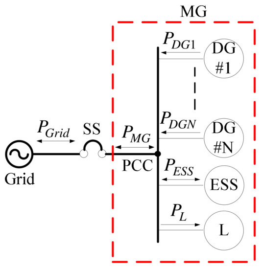 Currently, the designs of practical MGs mostly target at grid-connected applications. At the PCC, which is the responsibility division point of two systems, an SS is usually used to control the operation modes and protect both systems. Figure 1 shows the architecture of a typical grid-connected MG, where PGrid denotes grid power, PMG denotes MG power, PDGn denotes power of each DG system, PESS denotes ESS power, and PL denotes load power. As the adoption of MGs increases year by year, power flow control and power management of MGs are also becoming particularly important. In addition, when DG systems are integrated into an existing grid, the previously conventional (radial) distribution system will be transformed into a multi-power supply distribution system, and the magnitude and direction of power flows within will change substantially. In particular, DG systems are mostly interfaced using power electronics; without proper circuitry and control strategy, a DG system will be unstable and prone to failure. In recent years, with the continuous advancement of related technologies, many high-tech industries are demanding increasingly better PQ. Poor PQ can easily lead to faults, tripping, shortened life, and even damage. However, since power electronic equipment is mostly controlled with high-frequency pulse width modulation (PWM), power contamination caused by harmonics is quite serious. Therefore, constructing a stable and high-quality power system with advanced power electronics technologies is an extremely important task for modern distribution systems.