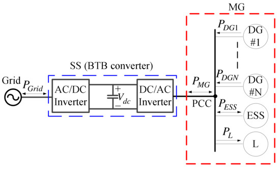 A grid-connected MG with a BTB inverter-based SS.