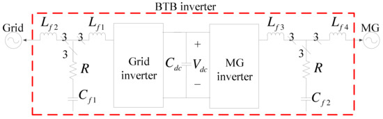 The BTB inverter-based hardware system proposed in this paper consists of two SiC-based three-phase voltage source inverters (VSIs) with the same configuration for both grid and MG sides, as shown in Figure 3. The LCL filters are used to reduce harmonic currents caused by high-frequency PWM. In addition to ensuring good PQ of the MG, the proposed inverter system is also capable of power management and can adjust active and reactive powers according to real-time requirements.