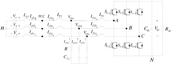 Figure 4 shows the architecture of the grid inverter, where Lg1 denotes grid inductances, Lf1 and Lf2 denote filter inductors, Cf1 denotes filter capacitors, R denotes damping resistors, S1-1 through S1-6 denote semiconductor switches, Cdc denotes DC link capacitor, Rdc denotes equivalent DC load, n denotes grid ground, Va, Vb, and Vc denote grid three-phase voltages, Ig1a, Ig1b, and Ig1c denote grid three-phase line currents, If1,a, If1,b, and If1,c denote three-phase line currents through Lf1, If2,a, If2,b, and If2,c denote three-phase line currents through Lf2, Vcf,a, Vcf,b, and Vcf,c denote three-phase voltages across Cf1, Icf,a, Icf,b, and Icf,c denote three-phase line currents through Cf1, and Vdc denotes DC link voltage.