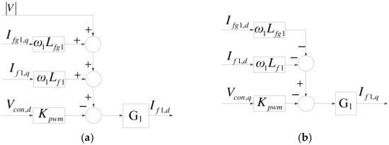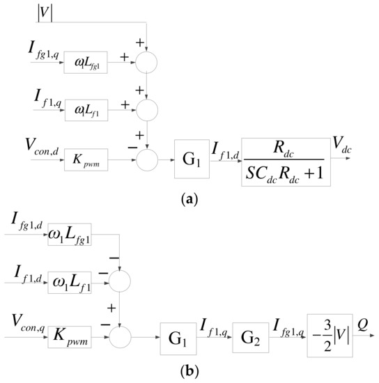 Since there is only active current in the DC interface, DC link voltage can be controlled solely through If1,d. Therefore, the transfer function of DC link voltage is as shown in (7), and thus the complete d-axis mathematical model of the grid inverter is as shown in Figure 6a. The reactive power of the grid inverter can be controlled through Ifg1,q. As a result, the complete q-axis mathematical model of the grid inverter can be obtained as shown in Figure 6b, where G2 is shown in (8).