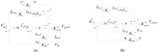Grid inverter outer-loop controllers: (a) DC link voltage controller (d axis); (b) reactive power controller (q-axis).