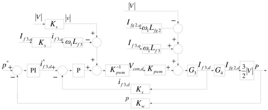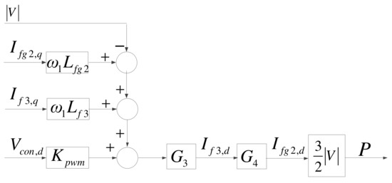 The architecture of the MG inverter is identical to that of the grid inverter, as shown in Figure 10. However, the outputs of the MG inverter include both active and reactive powers; therefore, its d-axis mathematical model is used to control active power and is slightly different from that of the grid inverter, as shown in Figure 11, where G3 is identical to G1, and G4 is identical to G2.