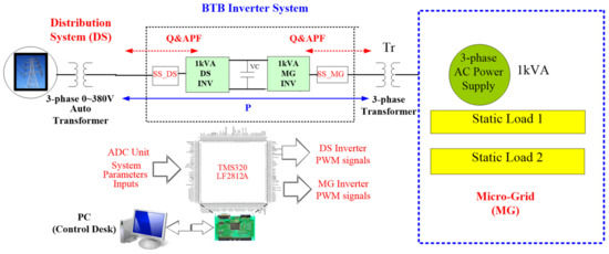 For system verification objectives, simulation and implementation are conducted based on the configuration shown in Figure 14. The system is simulated in a MATLAB/Simulink environment, and then software–hardware integration implementation is performed with TI DSP TMS320LF2812 as control core. TMS320LF2812 is the industry’s first 32 bit control chip, with flash memory and up to 150 million of instructions per second (MIPS) calculating bandwidth; it belongs to C28x series, which are specifically designed for industry and automation control with complex control algorithms. As can be seen in Figure 14, with the proposed configuration the BTB inverter is capable of performing many functions, including bidirectional active/reactive power flow control, seamless operating mode switching, grid PQ improvement and voltage stabilization, MG PQ improvement and reactive power compensation. However, in order to avoid making this paper too long, only two cases are elaborated here for demonstration purposes. The first case focuses on active/reactive power control of MG inverter, and the second case focuses on PQ improvement control.
