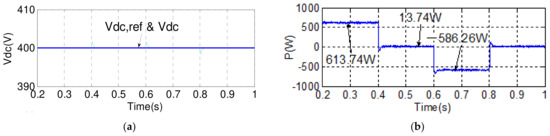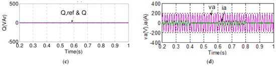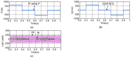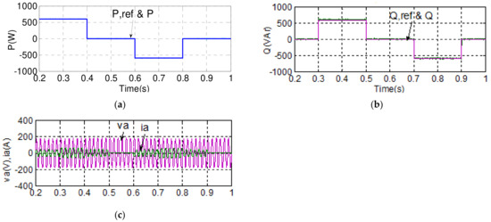 To demonstrate the advantage of using the proposed BTB inverter in achieving stable power flow control features in the MG inverter under a disturbed grid voltage, the simulation case 2 explores active/reactive power flow tracking control results of both grid and MG inverters under a voltage swell/sag scenario happening in the grid. The simulation scenario is described as follows: the voltage swell is set at 1.15 pu and the voltage sag is set at 0.85 pu. The voltage variation sequence is as follows: nominal voltage, then swell, then nominal, and then sag (1.2 periods each). In this case, the grid inverter maintains the DC link voltage at 400 V and reactive power at 0 VAR; active power command for the MG inverter is set at 600 W during 0.2–0.4 s, 0 W during 0.4–0.6 s, −600 W during 0.6–0.8 s, and 0 W during 0.8–1 s, while reactive power command for MG inverter is set at 0 VAR during 0.2–0.3 s, 600 VAR during 0.3–0.5 s, 0 VAR during 0.5–0.7 s, −600 VAR during 0.7–0.9 s, and 0 VAR during 0.9–1 s. Simulation results are shown in Figure 17 and Figure 18, where it can be clearly observed that both the controlled active and reactive powers of the MG inverter follow their individual references closely and arenot affected by the poor grid voltage condition. Figure 17 shows the simulated waveforms of the grid inverter in case 2, in which the grid voltage is disturbed: Figure 17a shows the DC link voltage and its reference; Figure 17b shows the active power; Figure 17c shows the reactive power and its reference; and Figure 17d shows the phase-a voltage and current waveforms. Figure 18 shows the simulated waveforms of the MG inverter in case 2: (a) active power and its reference; (b) reactive power and its reference; and (c) phase-a voltage and current waveforms.