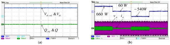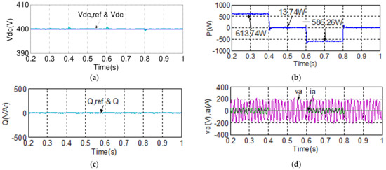 To demonstrate the real-time power flow control function using the proposed BTB inverter between the grid and MG, the simulation case 1 explores a set of active/reactive power flow tracking control results of both grid and MG inverters under normal voltage conditions. The simulation scenario is described as follows: grid inverter maintains the DC link voltage at 400 V and reactive power at 0 VAR; active power command for the MG inverter is set at 600 W during 0.2–0.4 s, 0 W during 0.4–0.6 s, −600 W during 0.6–0.8 s, and 0 W during 0.8–1 s, while reactive power command for the MG inverter is set at 0 VAR during 0.2–0.3 s, 600 VAR during 0.3–0.5 s, 0 VAR during 0.5–0.7 s, −600 VAR during 0.7–0.9 s, and 0 VAR during 0.9–1 s. Simulation results are shown in Figure 15 and Figure 16. Figure 15 shows the simulated waveforms of the grid inverter in case 1, in which the status of grid voltage is normal: Figure 15a shows the DC link voltage and reference; Figure 15b shows the active power; Figure 15c shows the reactive power and its reference; and Figure 15d shows the phase-a voltage and current waveforms. Figure 16 shows the simulated waveforms of the MG inverter in case 1: (a) active power and reference; (b) reactive power and reference; and (c) phase-a voltage and current waveforms.
