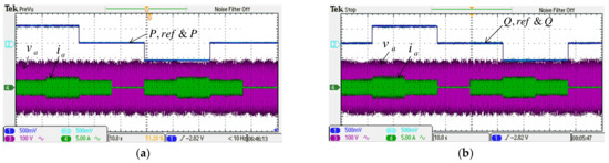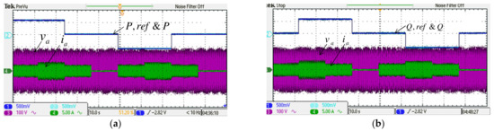 To verify the performance of the proposed control scheme, two typical experimental tests are carried out. The first test case aims to verify the results of simulation case 1. Results are shown in Figure 19 and Figure 20. Dynamic command tracking and the decoupling effect of the MG inverter active/reactive power control are the main focuses here. It can be observed in Figure 20a that power tracking is indeed very effectively performed.