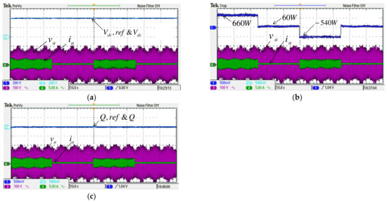 Implemented grid inverter waveforms in case 2: (a) DC link voltage and reference/a phase voltage and current; (b) active power/a phase voltage and current; (c) reactive power/phase-a voltage and current.
