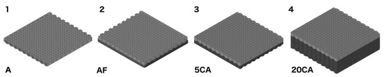 Figure 1. Schematic representation of 3D constructs. Light grey represents SSD-loaded alginate hydrogels, and dark grey represents chitosan hydrogels: (1) 3D printed 5-layer alginate loaded with SSD alone (A); (2) 3D printed 5-layer alginate + chitosan film (AF) (3) 3D printed 5-layer chitosan hydrogel + 3D printed 5-layer alginate (5CA); (4) 3D printed 20-layer chitosan hydrogel + 3D printed 5-layer alginate (20CA).
