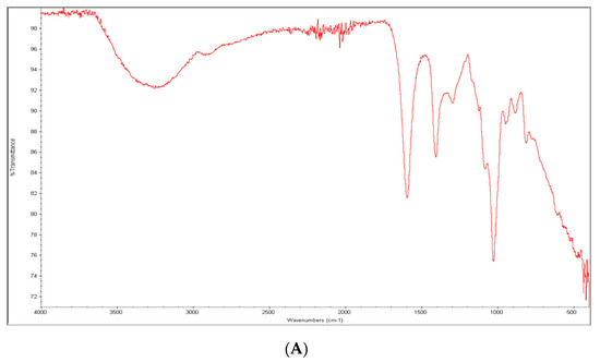 The spectrum of the sodium alginate powder (Figure 3A) showed typical signals in the 4000–600 cm−1 wavelength interval. In particular, a wide peak at 3450 cm−1 typical of the stretching of the -OH group is present, as well as two peaks at 1618 and 1440 cm−1 for the -COO group and an acute peak at 1050 cm−1 for the C=O stretching. Analogously, the spectrum of the SSD powder (Figure 3B) revealed that characteristic absorbance peaks at 3390 and 3340 cm−1 referred to the symmetric and asymmetric stretching of the -NH2 groups, respectively. The group at 1655 cm−1 corresponds to the bending of the -NH2 group, whereas those at 1595 and 1500 cm−1 are related to the phenolic skeleton. The peaks observed at 1230 and 1130 cm−1 are characteristic of the asymmetric vibration of the SO2 group. Aromatic vibration appears at 1070 cm−1.