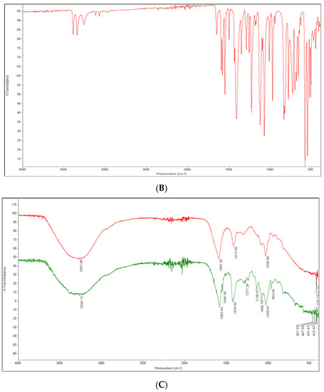 Figure 3. ATR–FTIR spectra. (A) sodium alginate; (B) silver sulfadiazine powders; (C) comparison between the ATR–FTIR spectra of alginate hydrogel (in red) and the alginate SSD-containing hydrogel (in green).