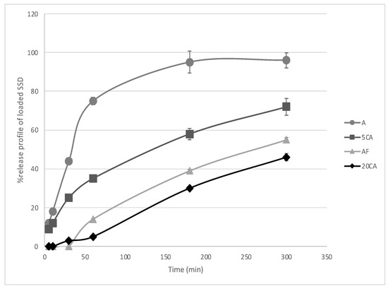 Figure 4. Percent release of loaded SSD from different hydrogel combinations: A (circle), AF (triangle); 5CA (square), 20CA (rhombus). Release tests (n = 3) were performed at 37 °C in simulated wound fluid [42] composed of CaCl2 anhydrous 0.02 M; NaCl 0.4 M, tris methylamine 0.08 M (final pH 7.5).