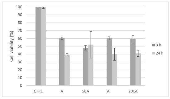 Cytotoxicity tests were conducted in order to evaluate the effect of SSD on cell vitality in relation to the different release behavior of the constructs. In general, the results demonstrated that the vitality of the cells in contact with the constructs loaded with the drug is much lower. Compared to the control (no scaffold), resorufin fluorescence in the presence of scaffold A showed a reduction to 60.8 ± 1.5%, 48 ± 17% for 5CA, 60 ± 8% for AF and 59 ± 4% for 20CA constructs (p < 0.05) after 24 h of incubation (Figure 5). The data observed for all the constructs indicate that within 24 h, the release of SSD causes suffering to the cells. This observation is in agreement with the data reported in the literature, reporting the cytotoxic effect of SSD on in vitro cell cultures [55]. In vitro studies have also shown that SSD cytotoxicity can be reduced by controlling the administration of the active agent [56]: based on the release experiments, it was expected that the major cytotoxicity would have been determined by A scaffolds, as these constructs were characterized by the major quantity of SSD released and in the shortest time, as previously described. From data obtained after 3 h of incubation, the construct causing more cytotoxicity is the 5CA (Figure 5). Moreover, the cytotoxicity of the four different constructs was very similar. To explain these results, it is necessary to take into consideration that the conversion of resazurin to resorufin, used for the vitality tests, occurs by an oxidation reaction, which is also one of the main mechanisms of SSD degradation. The observed results are thus probably determined by a combined effect related not only to the intrinsic SSD cytotoxicity but also to its degradation.