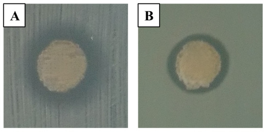 Figure 6. Kirby–Bauer antimicrobial activity assay against multidrug-resistant strains of S. aureus (A) and P. aeruginosa (B).
