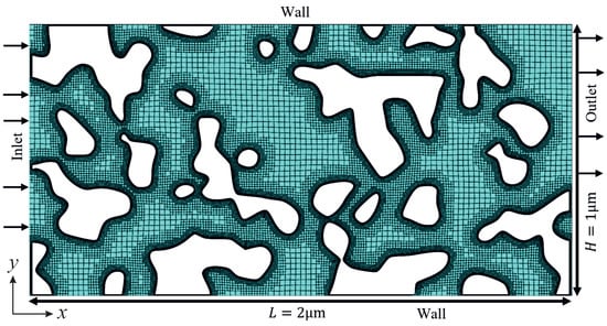 An open-source code, PoreSpy [37], was used to replicate the geometry of the porous material for numerical simulations. PoreSpy includes a variety of predefined functions to extract data from images of porous material (for example, those obtained using X-ray tomography) and to generate artificial geometries of porous materials [37,38,39]. The Blobs function from the PoreSpy code generates an image with random noise and then applies a Gaussian blur to the image, creating a correlated field with a Gaussian distribution. Nanoporous materials often have random bicontinuous structures with complex pore morphologies in which heat and fluid flow are inherently three-dimensional. Computational costs associated with running three-dimensional models to simulate gas flow in nanoporous materials using particle-based methods, such as molecular dynamics (MD) and direct simulation Monte-Carlo (DSMC), are often considerably high and thus current studies are limited, to a great extent, to two-dimensional problems (see for instance [9,19,40,41,42]). Figure 1 shows a representative geometry of the computational domain, the grid used in the simulations, and the boundary conditions applied to the outer boundaries of the computational domain. The computational domain is a rectangular block that encompasses the porous structure and has a length (L) of and a height (H) of . Minimum cell spacing was selected to be smaller than the molecular mean free path and about [13], resulting in a computational grid with 80,000 cells and the minimum cell spacing of about 5 × 10−9 for the case with a Knudsen number of 0.5. The minimum cell spacing chosen in the present simulations () is sufficiently fine to achieve grid-independent results according to the guidelines [43,44,45]. The inlet-to-outlet pressure ratio () was set to 2 in the simulations.